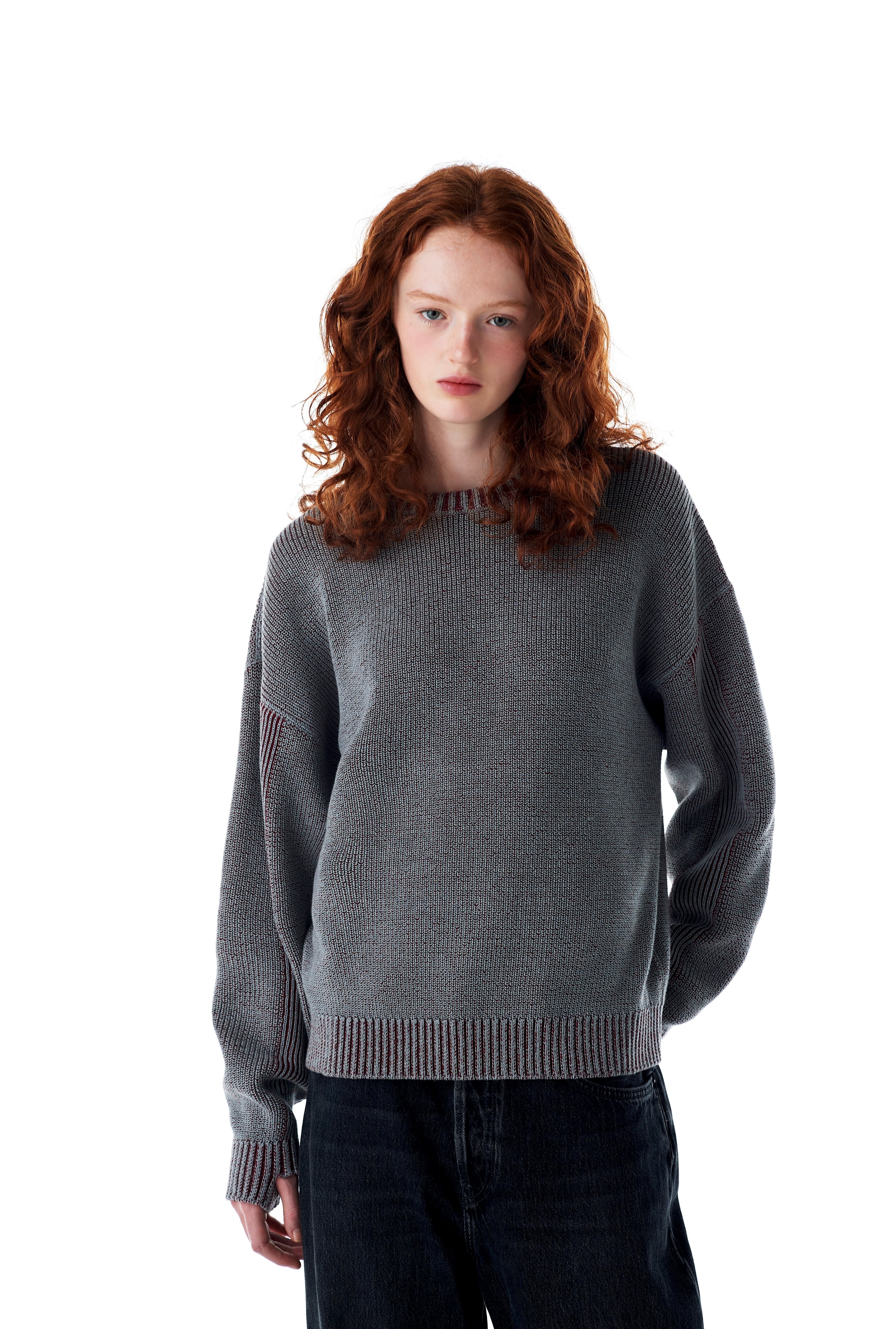 二種類の異素材糸を組み合わせて編み上げ、ヴィンテージライクな表情に仕上げたクルーネックニット。