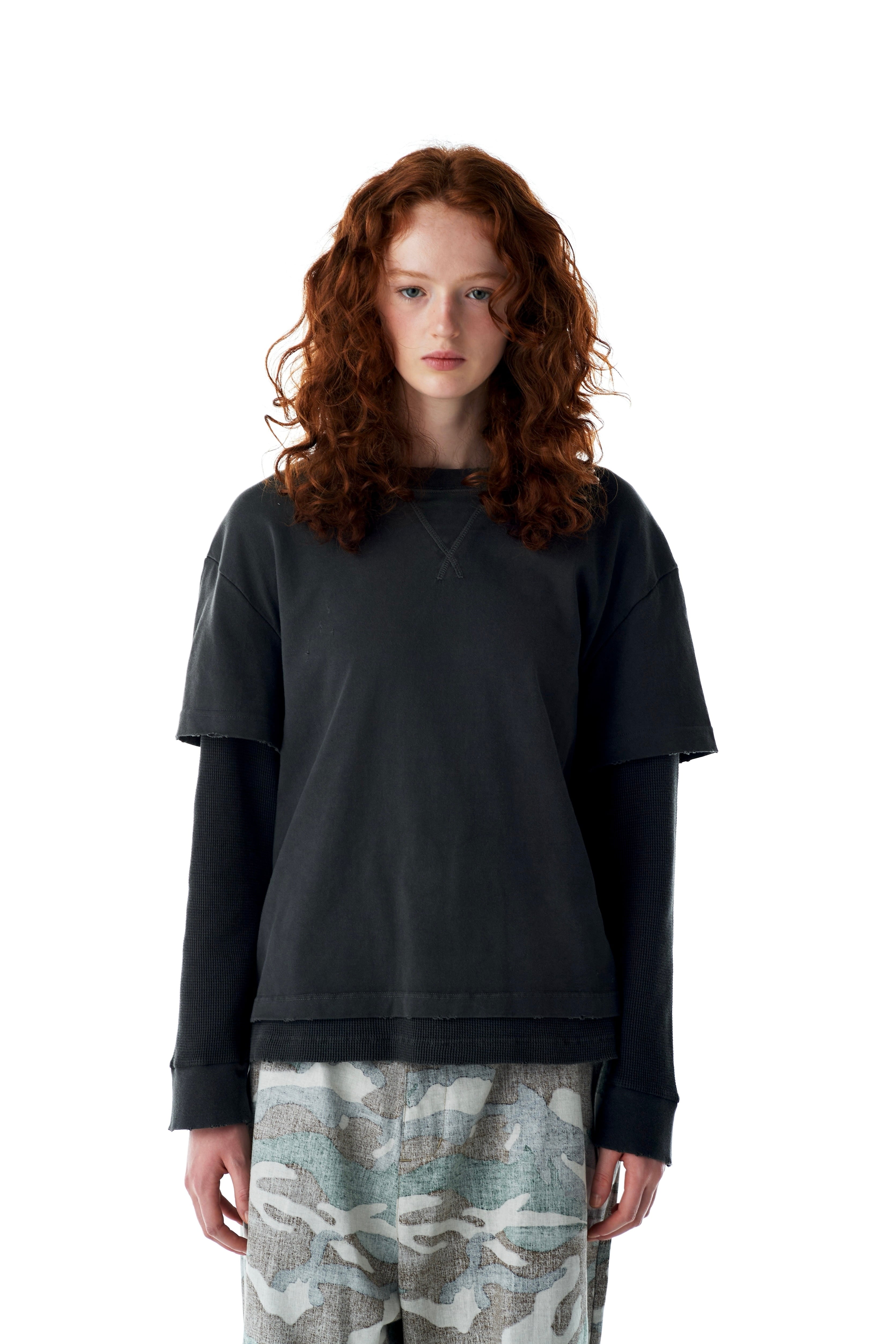 裾リブやネック周りには軽いダメージ加工を加え、奥行きのある表情とリラックスシルエット仕上げ。日本製。