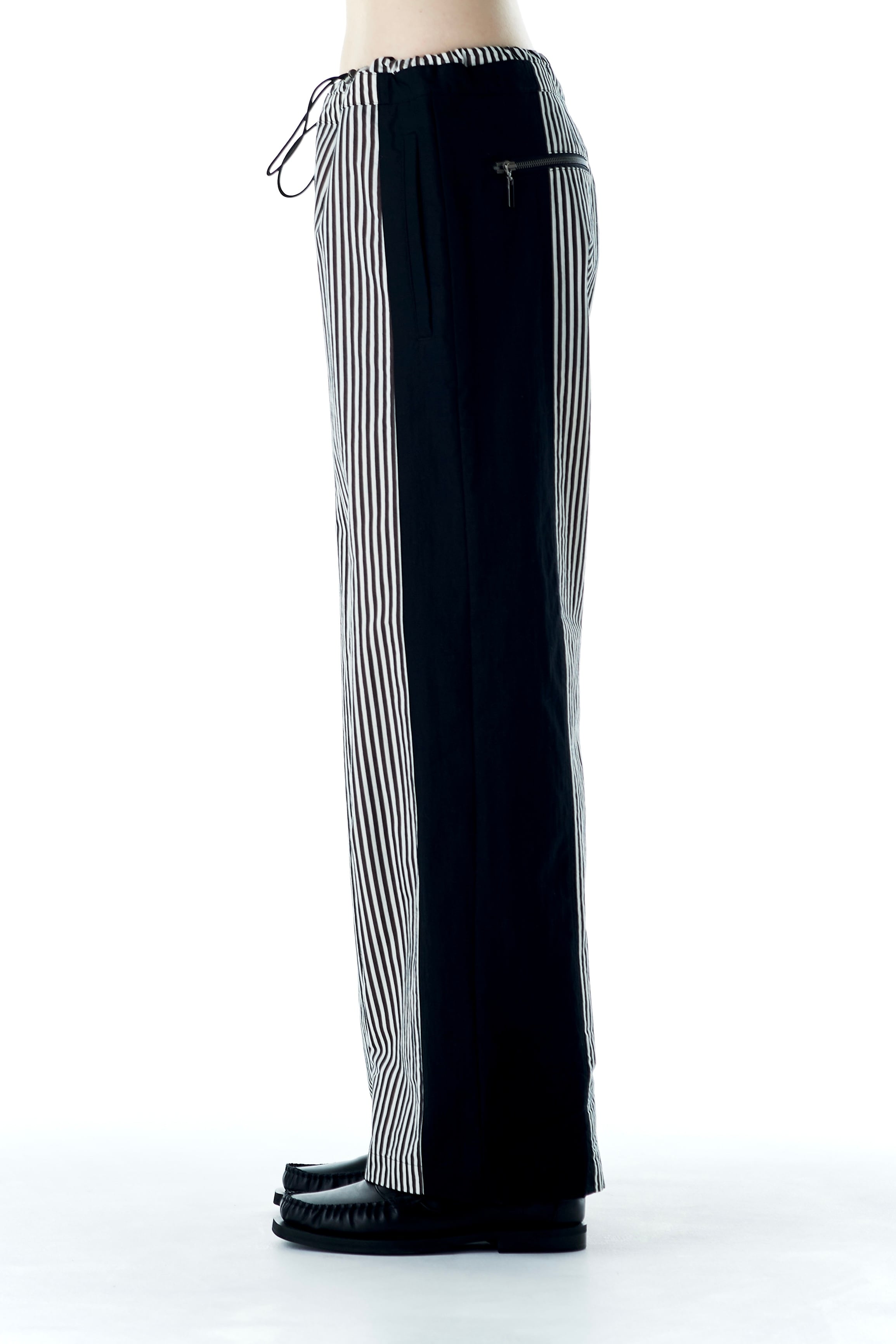 オリジナルプリントのストライプ生地と無地素材を組み合わせた、ドッキングデザインのパンツ。