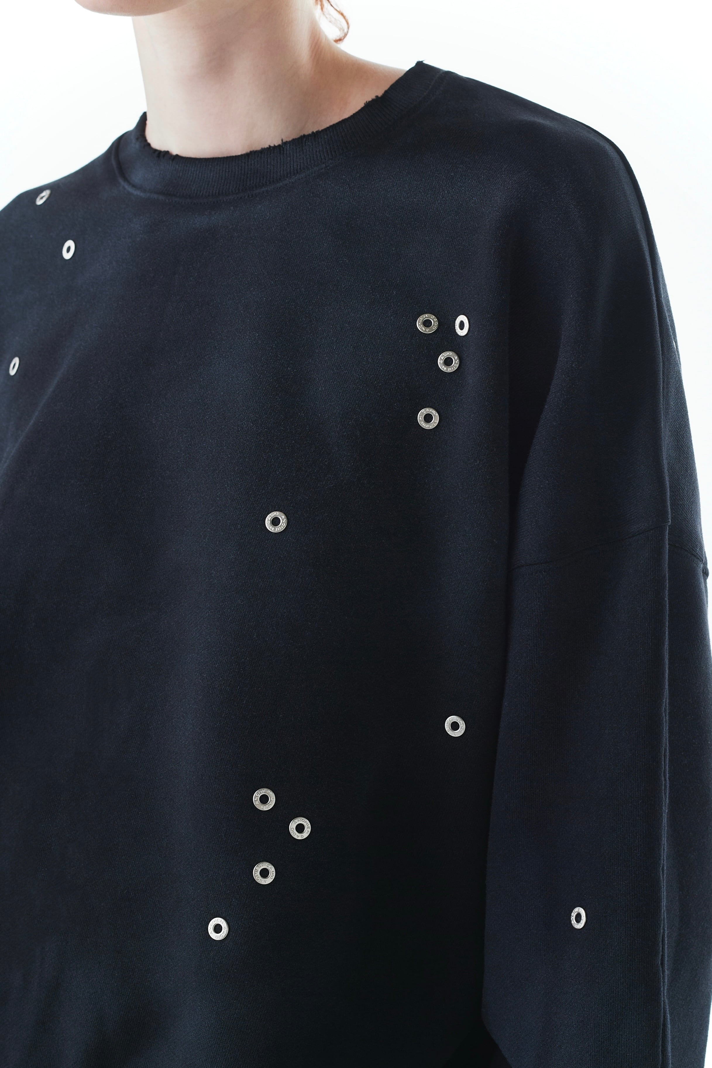 ブランドロゴ入りのメタルアイレットを全体に配したデザイン。