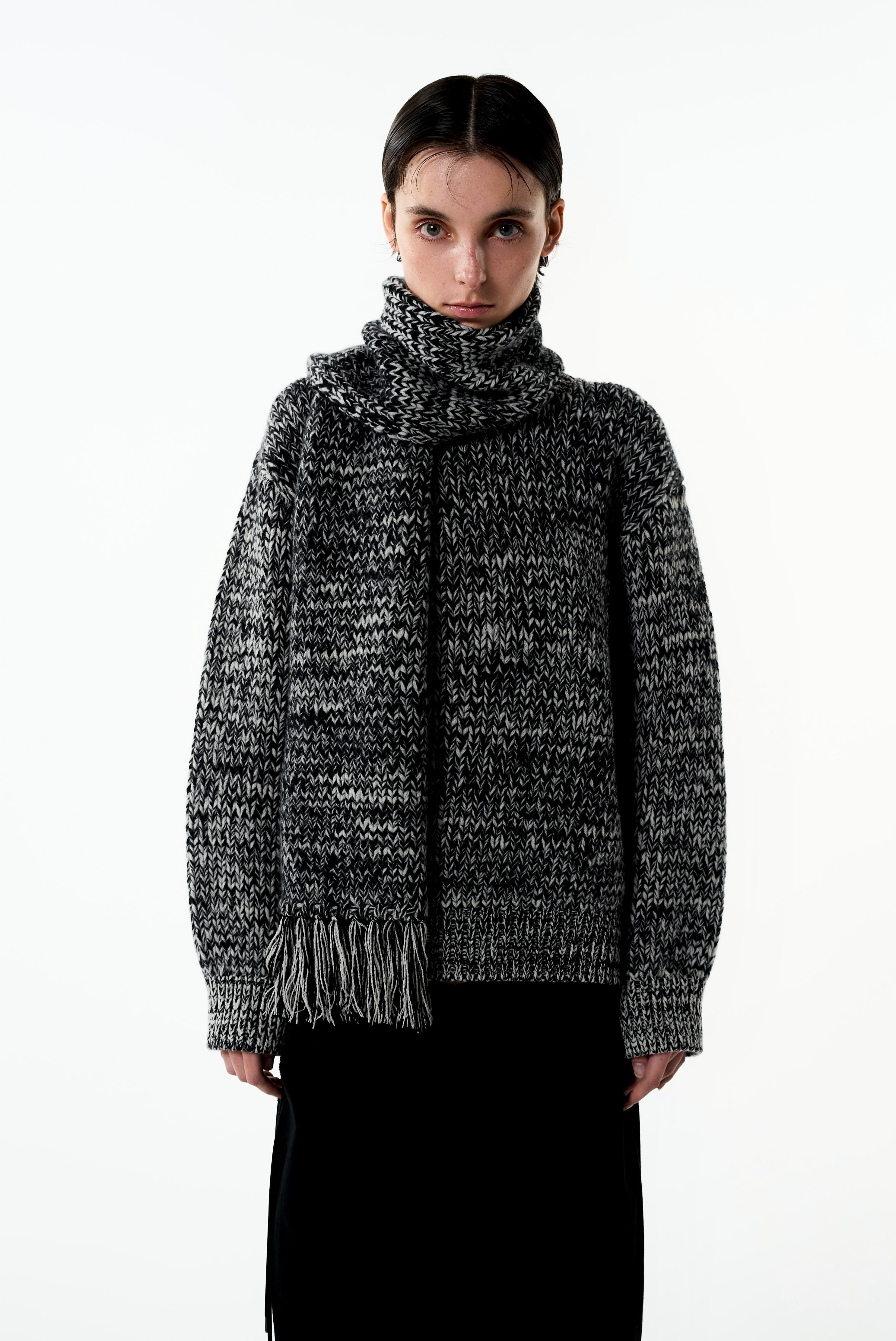 大胆な長さと、両端にあしらったフリンジがデザインのアクセント。